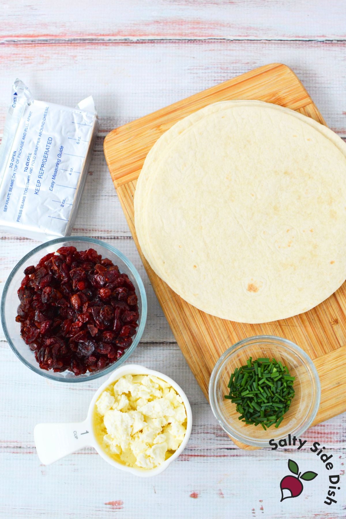 - 1 ½ cups dried cranberries (about a 6 oz package) – look for sweetened dried cranberries; they’re softer and more flavorful in pinwheels.