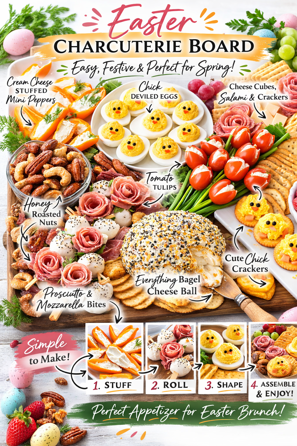 - Chick Deviled Eggs — these are the showstopper. Cut crosswise with peppercorn eyes and a carrot beak, they are almost too cute to eat and they anchor the board immediately.