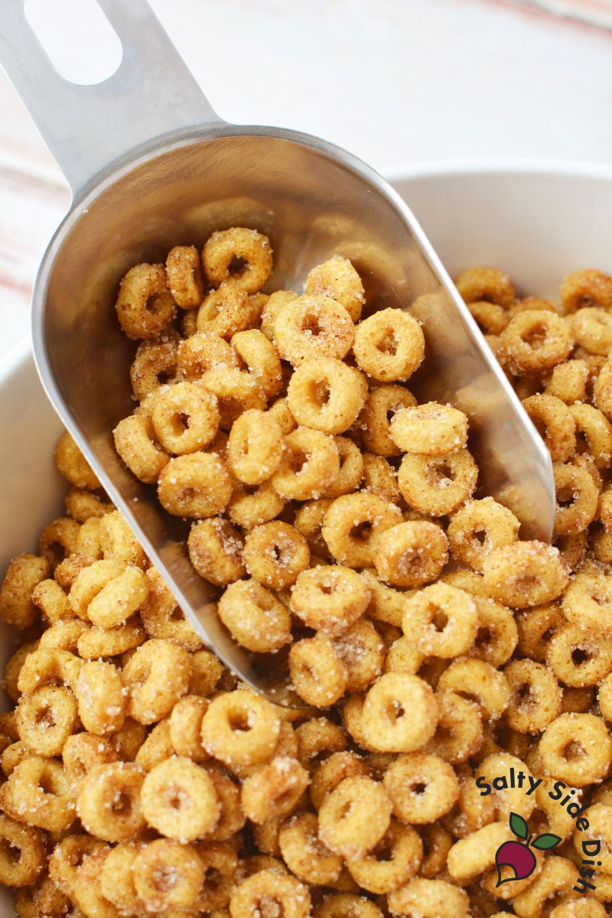 Cheerios cereal — Plain original Cheerios are what you want. The classic cereal you know already pairs perfectly with the cinnamon sugar coating. Don’t use Honey Nut or any flavored variety because they just get too sweet. Unless you are adding to a premade snack mix, then it might be ok.