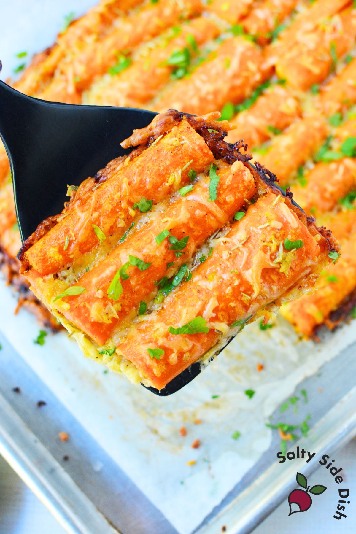 - Let the carrots rest on the pan for a couple of minutes before removing so the cheese crust can firm up. Transfer to a serving platter and top with fresh chopped parsley if desired.