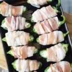 Wrap one half slice of bacon around each pepper, tucking the ends in or under the jalapeno and place onto the baking sheet. If bacon ends are left out, they may unravel while baking. Using a toothpick to secure is fine as well just remove before serving.