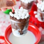 Hot Chocolate Bomb Cups, an easier way to make Hot Chocolate Bombs with red solo shot glasses, filled to the rim cocoa powder and a peppermint dipping stick.